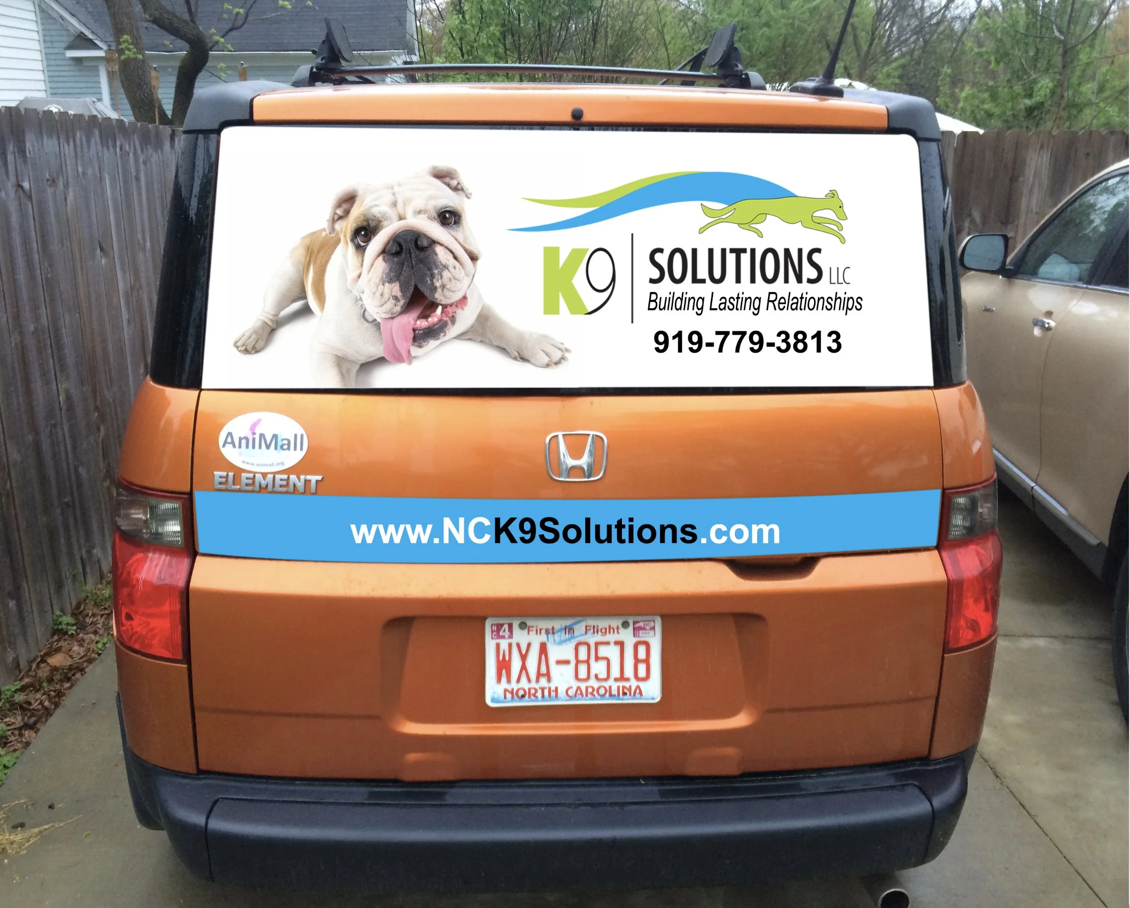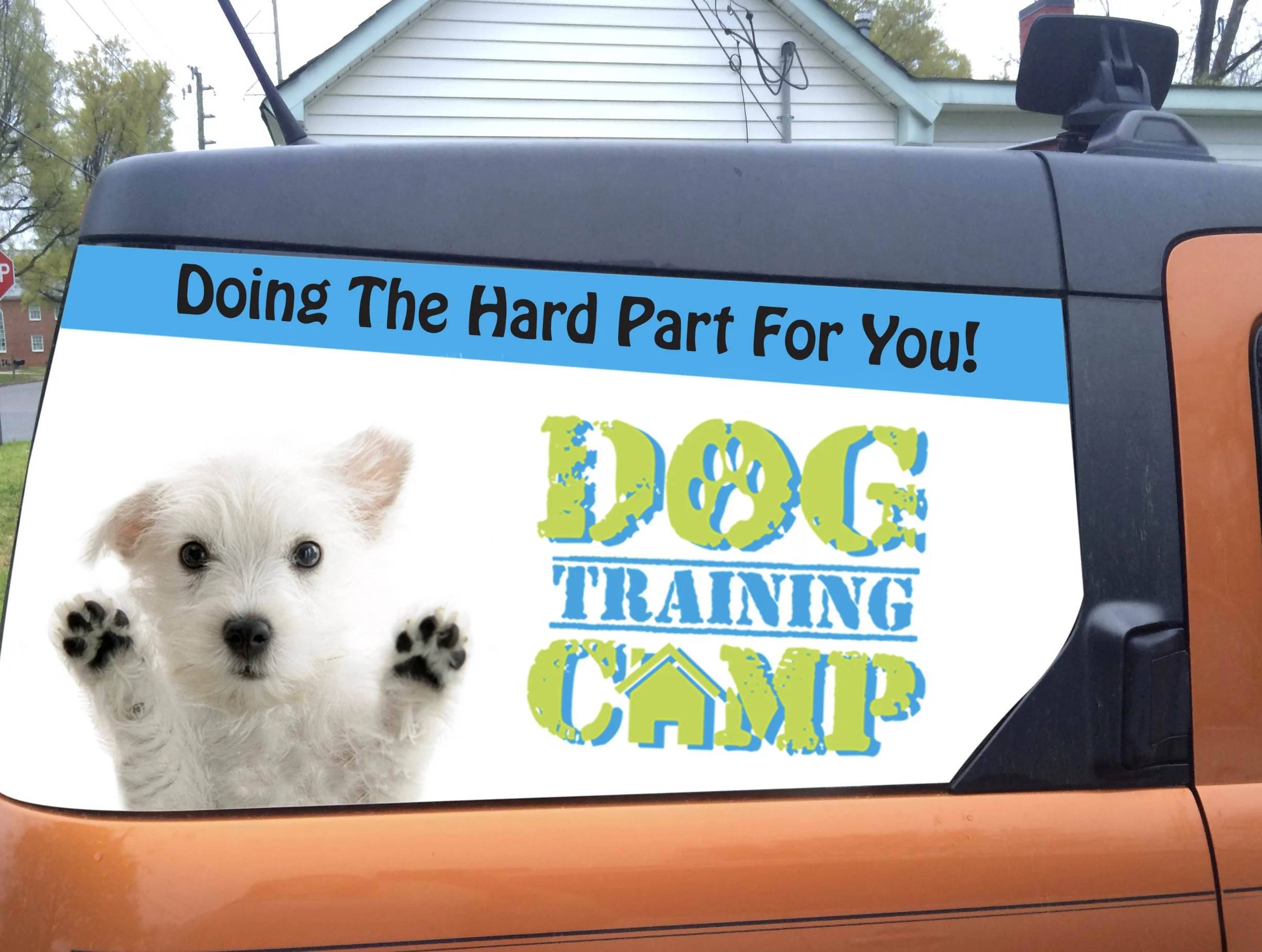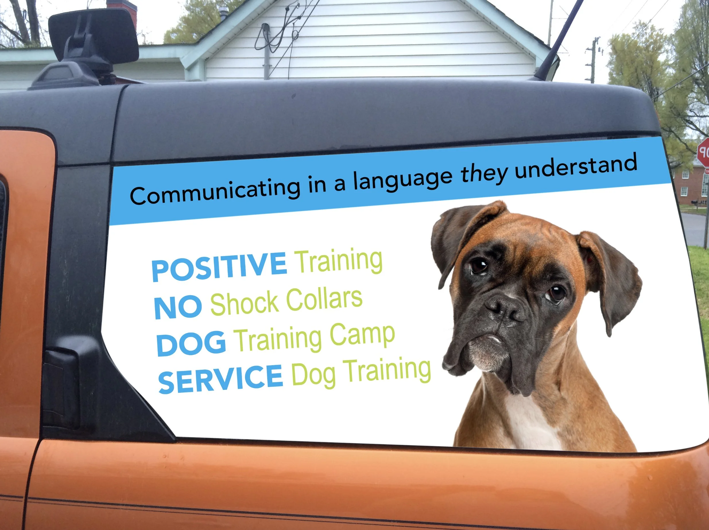 The back of a white minivan with a decal of a dog and a cat peeking out a window, with a speech bubble saying, 'What's in your bowl?' The decal also includes text promoting healthy pet food, the website www.WholesomePetFood.com, and a phone number, 540-346-0006.